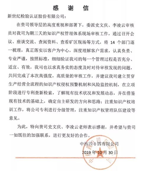 四O四對(duì)認(rèn)證審核工作高度重視、積極配合,順利通過知識(shí)產(chǎn)權(quán)管理體系的認(rèn)證審核,證書認(rèn)證范圍是:與核燃料的加工,核設(shè)施退役相關(guān)的知識(shí)產(chǎn)權(quán)管理。在征得公司同意之后,BCC將四O四作為優(yōu)秀貫標(biāo)案例向國家知識(shí)產(chǎn)權(quán)局進(jìn)行了推薦。