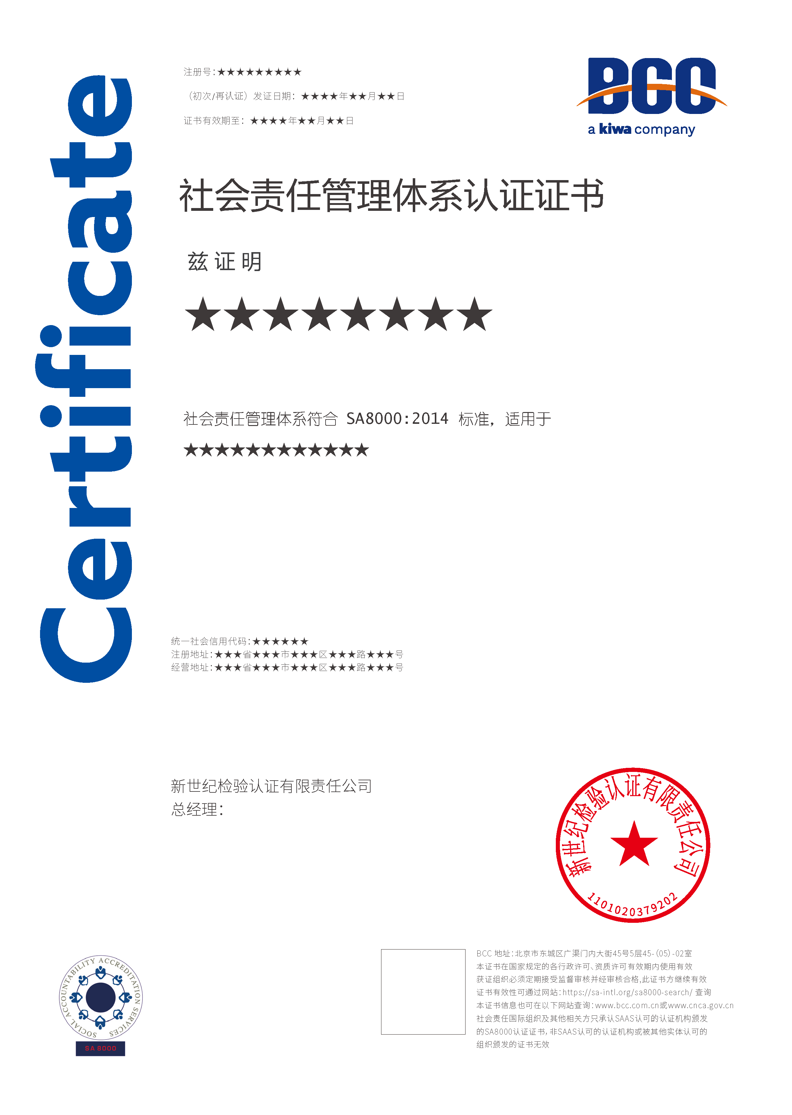 社會(huì)責(zé)任管理體系(SA8000)是全球首個(gè)道德規(guī)范國(guó)際標(biāo)準(zhǔn),其宗旨是確保供應(yīng)商所供應(yīng)的產(chǎn)品,皆符合社會(huì)責(zé)任標(biāo)準(zhǔn)的要求,目的是保護(hù)勞動(dòng)環(huán)境和條件、勞工權(quán)利等。