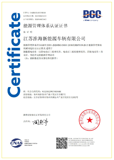 認證不僅是對淮海新能源車輛在能源管理領域卓越表現的高度認可,更是對其在新能源領域持續(xù)創(chuàng)新與高質量發(fā)展的有力見證。——近日,江蘇淮海新能源車輛有限公司(簡稱:淮海新能源車輛)獲新世紀檢驗認證有限責任公司(Kiwa BCC)頒發(fā)的能源管理體系認證證書。