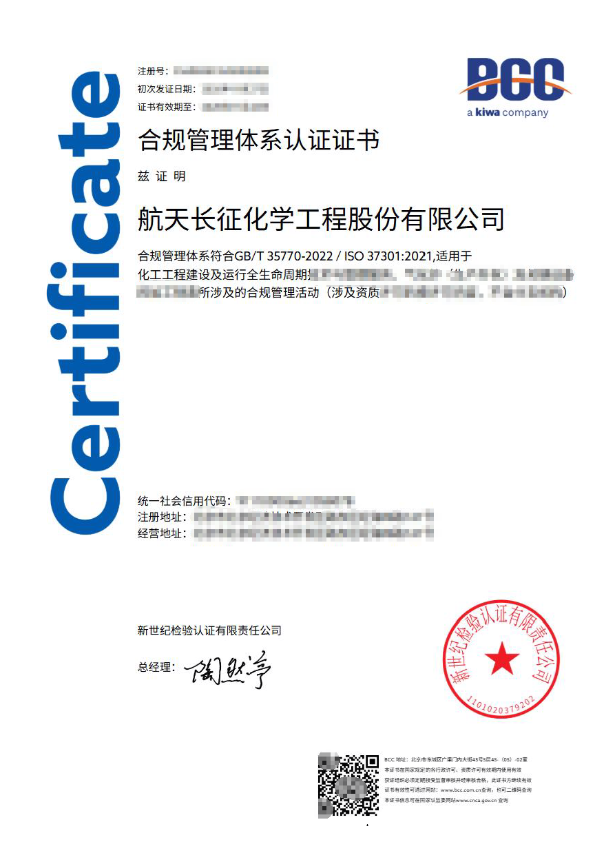 近日,新世紀(jì)檢驗(yàn)認(rèn)證有限責(zé)任公司(Kiwa BCC)派出審核組為航天長(zhǎng)征化學(xué)工程股份有限公司(下簡(jiǎn)稱航天工程公司)實(shí)施合規(guī)管理體系認(rèn)證審核。