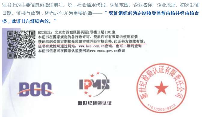 證書上的主要信息包括注冊號(hào)、統(tǒng)一社會(huì)信用代碼、認(rèn)證范圍、企業(yè)名稱、企業(yè)地址、初次發(fā)證日期、證書有效期,還有這句尤為重要的話——“ 獲證組織必須定期接受監(jiān)督審核并經(jīng)審核合格,此證書方繼續(xù)有效。”