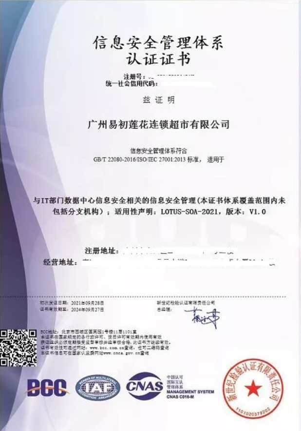 本次獲得BCC頒發(fā)的信息安全管理體系認(rèn)證證書,標(biāo)志著廣州易初蓮花在識(shí)別信息安全風(fēng)險(xiǎn),減少可能存在的信息安全隱患,提升員工信息安全意識(shí),實(shí)現(xiàn)良性發(fā)展方面又邁進(jìn)一步!