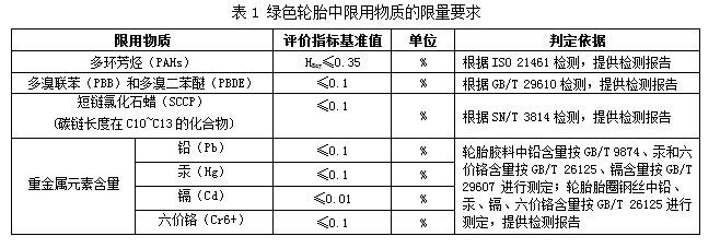 3、環(huán)境屬性。參照已發(fā)布并實(shí)施的《輪胎中限用物質(zhì)的限量要求》國(guó)家標(biāo)準(zhǔn),對(duì)輪胎胎面、胎側(cè)、胎圈(除鋼絲以外部分)、三角膠、內(nèi)襯層、內(nèi)胎、墊帶、胎圈鋼絲等各部位的多環(huán)芳烴(PAHs)、重金屬(鉛、汞、鎘、六價(jià)鉻)、短鏈氯化石蠟(SCCP)、多溴聯(lián)苯(PBB)和多溴二苯醚(PBDE)等限用物質(zhì)提出了要求,具體評(píng)價(jià)指標(biāo)基準(zhǔn)值及判定依據(jù)詳見表1。